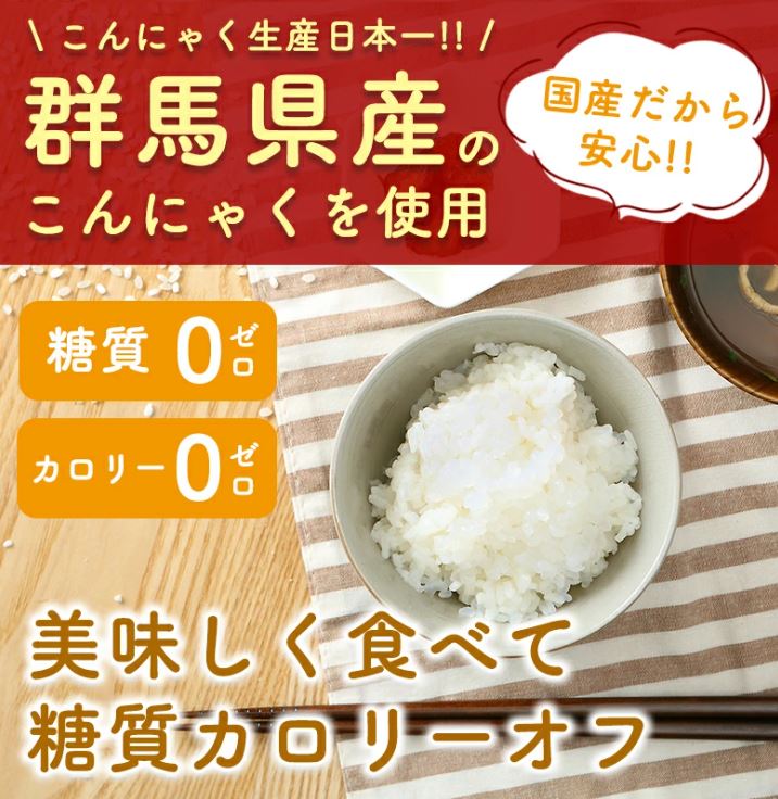 群馬県産のこんにゃく粉から作られた粒状こんにゃくは、お米と混ぜて炊くだけで見た目も食感も自然な仕上がりになります。