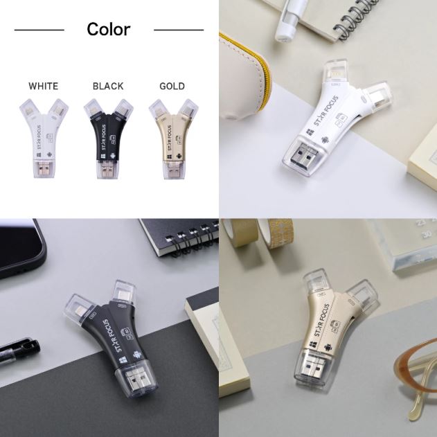 商品名 STAR FOCUS(スターフォーカス) 4in1 スマホ SD カードリーダー 商品説明 スマホ SDカードリーダーにより スマホの容量不足、ストレージ対策に SDカードリーダーがあればSDカードや PCにデータ移動がラクラク 大切な子供の写真や動画のバックアップが可能 PC、タブレット、スマホのデータ転送 相互交換、作業の効率化へ ほぼ全てのデバイスに対応 スマホからスマホへのデータ転送 クラウドやメール、Line等の 煩わしい通信制限の心配なし WiFi、スマホの通信も必要なし Googleフォト 有料化に伴う代替えに デジカメやビデオカメラ、アクションカメラ等で 撮った写真や動画を、スマホやタブレットで視聴できます。 最大1TB対応で大量の思い出を1枚のSDカードに投入可能! 専用アプリを使わずファイルアプリを使用しての、 操作が可能なので誰でも簡単にデータ移行が可能です。 商品仕様 ■カラー:全3色 ・ホワイト ・ブラック ・ゴールド ■接続端子(転送速度) ・Lightning 読込速度 27mb/s 書込速度 12mb/s ・USB2.0 読込速度 23.5mb/s 書込速度 18mb/s ・Type-C 読込速度 33.2m/s 書込速度 29.6m/s ・Micro USB 読込速度 32.5mb/s 書込速度 24.3m/s ■対応OS iOS 13~18/iPadOS 8~18/Android OS 5~15 macOS/Chrome OS/Windows11/10/8.1/8/Linux ■使用アプリ ・iPhone(iPhone15以降のType-C含む)/iPad:ファイルアプリ ・Galaxy:マイファイル ・OPPO:ファイルマネージャー ・Google pixel/Xperia/AQOUS...:Files ■対応SDカード ・SD規格:SDHC/SDXC microSDHC/microSDXC ・SD容量:最大1TB対応 ・SDスピードクラス:Class10 ・推奨メーカー: SanDisk/Transcend/SAMSUNG KIOXIA(TOSHIBA)/Lexar/Transcend *ノーブランド品は相性が悪く正常に作動しない場合があります。 有名メーカーでも信頼できるお店にてお買い求めください。 当店販売のSDカード、マイクロSDカードは動作確認済み *こちらの商品はSDカードもしくはマイクロSDカードを 差込まないとご使用できません。 対応機種 ■iOS/iPadOS(アイオーエス/アイパッドオーエス) iPhone 17/17 pro/17 pro Max/iPhone Air iPhone 16/16 Plus/16 pro/16 pro Max/16e iPhone 15/15 Plus/15 pro/15 pro Max iPhone 14/14 Plus/14 pro/14 pro Max iPhone 13/13 Pro/13 Pro Max/13 mini iPhone 12/12 Pro/12 Pro Max/12 mini iPhone SE(第3/第2/第1世代) iPhone 11/11Pro/11Pro Max iPhone X/XS/XS Max/XR iPhone 8/8 Plus/7/7 Plus iPhone 6s/6s Plus 13/11インチiPad Pro(M4) 12.9インチiPad Pro (第6/第5/第4/第3/第2/第1世代) 11インチiPad Pro(第4/第3/第2/第1世代) 10.5インチiPad Pro 9.7インチiPad Pro 13/11インチiPad Air(M3) 13/11インチiPad Air(M2) iPad Air(第5/第4/第3世代/2) iPad(A16/第10/第9/第8/第7/第6/第5世代) iPad mini(A17Pro/第6/第5世代/4) *掲載のiPadはWiFiモデル/WiFi + Cellularモデル 両対応 iPod touch(第7世代) *非掲載のiPhone/iPad/iPodは非対応 ■Android OS(アンドロイド) ・Samsung Galaxy(ギャラクシー) S24/S24 Ultra/S23/S23 Ultra/S22/S22 Ultra/S21/S21+/S21 Ultra/A55/A54 ・SONY Xperia(エクスペリア)(1/5/8/10/Ace/Pro) ・SHARP AQOUS(アクオス)(R5G/zero5G basic) ・FUJITSU arrows 5G ・HUAWEI(ファーウェイ) P20/P30/P40 Pro 5G ・Xiaomi(シャオミ) Redmi Note 11 Pro/9T/Note 9s ・OPPO Reno5 A/Reno3 A/A55s ・Google pixel(グーグル ピクセル) 10/10 Pro/10 Pro XL/10 Pro Fold/9/9 Pro/9 Pro XL/9 Pro Fold/8a/8/8 Pro/7a/7/7 Pro/6a/6/6 Pro/5a/5/4a etc... *OTG機能(USBホスト)の無いAndroid非対応 USB OTG Checker(無料アプリ)で対応確認 *Vivo/OPPO/Xperia/arrowsの各Androidスマホは接続する前に OTG機能を設定画面で有効にする必要があります。 ■macOS(マックオーエス) 13インチ MacBook Pro(2016/2017/2018/2019/2020) 13インチ MacBook Pro(M1 2020/M2 2022) 14インチ MacBook Pro(2021) 15インチ MacBook Pro(2016/2017/2018/2019) 16インチ MacBook Pro(2019/2021) MacBook Air Retina(2018/2019/2020) MacBook Air(M1 2020/M2 2022) iMac/iMac Pro(21.5/24/27inch) Mac mini(2018/2020) Mac Pro Mac Studio etc... ■Chrome OS(クロームオーエス) Chromebook(クロームブック) ■Windows Surface(サーフェス)(Go/Go 2/Go 3) Surface Pro(7/7+/8/X) Surface Book 2/3(13.5/15インチ) Surface Laptop 3/4(13.5/15インチ) Surface Laptop Go DELL Inspiron NEC LAVIE/HP pavilion FUJITSU FMV LIFEBOOK Panasonic Let's note dynabook/ASUS VivoBook etc... サポートファイル ■文章ファイル ・Microsoft Office DOC/DOCX/XLS/XLSX/PPT/PPTX ・Apple iWork/KEY/Numbers/Pages PDF/HTM/HTML/TXT/RTF ■画像ファイル JPG/JPEG/BMP/BMPF TIF/TIFF/PNG/GIF XBM/ICO/CUR ■動画ファイル WMV/AVI/MKV/MP4 MOV/FLV/MPG/RMVB M4V/TS/3GP ■音楽ファイル MP3/AIF/WAV AIFF/M4A/AAC 付属品 ・SDカードリーダーx1個 ・日本語説明書 兼 保証書x1冊 ※SDカード、microSDカード別売り 当店にて販売中! 保証 ■当店1年保証 初期不良、通常使用の不具合は1年以内は無償交換させていただきます。 *まず説明書の動作不良の解消方法をご確認ください。 誠実に対応させていただきますので、 不具合の場合は注文番号をご用意の上、 メール、問い合わせより当店にご連絡ください。 レビューからご連絡いただくのではなく、上記よりお願いします。 ■保証対象外 ・記録データの破損、紛失 ・高温多湿、異常電圧、粉塵の多い場所での使用による故障 ・落下、水没、改造等指定外使用による故障 検索キーワード:SDカードリーダー microSD マイクロSD カードリーダー 携帯 スマホ 写真 カメラ アルバム 保存 移行 整理 データ バックアップ コピー ストレージ デバイス フォー