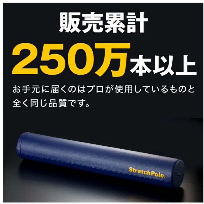 サイズ : 長さ約98cm x 直径約15cm 重量 : 約700g 芯材 : EPE カバー : 合成皮革 ※ご身長155cm以下の小柄な女性やご高齢の方にはハーフカット、又はストレッチポールMXをおすすめしています。 ※使用の際は製品に同封しております「安全上のご注意」をご確認の上ご利用ください ストレッチポールに縦に仰向けに乗ると、アウターマッスル(外側の筋肉)がゆるむ。これはいわゆる”ストレッチ”の状態。 背中でストレッチポールを包み込むように乗り、そこで細かな動きをすることで、身体のインナーマッスル(深層部の筋肉)が刺激され、関節が正しい位置へと戻っていく。 また背骨の並びが整い、姿勢よく、身体が本来あるべき状態にリセットされるのを実感できるでしょう。 縦に仰向けに乗った時に、手足の重さで全身にストレッチ効果を与えられるよう、最適な形と高さ、ほどよい反発性と硬度に設計。 ストレッチポールから降りるときには、十分にほぐれた背中の筋肉が床面にまるで吸い付くかのような感覚をあなたに与えます。 ストレッチポールEXの中身の芯材には、強度と粘性にこだわりEPEを使用。 多くの運動指導者、トレーナー、理学療法士の声をもとに、試行錯誤を繰り返した結果、選び抜かれた芯材(EPE)と形状、 合成皮革カバー(PVC)を採用。プロが選んだ「本物」だけをお届けします。 ストレッチポールは、様々なシーンでご利用いただいています。オリンピック選手、プロスポーツ選手といったトップアスリート。モデルや美容、医療現場、介護現場、ヨガ・ピラティス。中高校生など、運動部に所属されているお子様。たった10分のエクササイズで、どなたでも簡単にご使用になれます(一般的なフォームローラーやヨガポール、エクササイズポールが硬すぎて痛いと感じる方にもオススメです)。 ☆エクササイズDVD付き 5本(5セット)以上の複数注文の場合は出荷に数日いただくことがございます、あらかじめご了承ください。