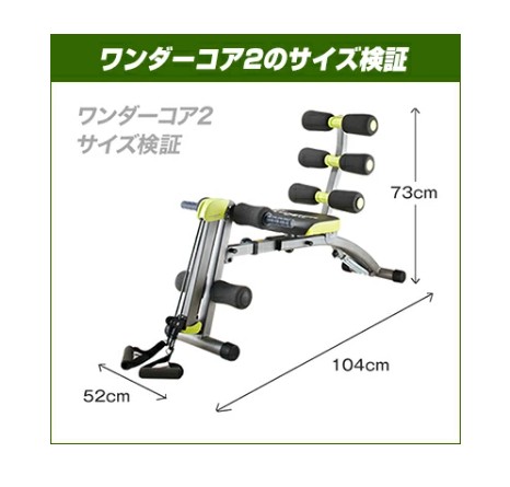 ワンダーコア スマート・ライムグリーン DVD付・・Style:ワンダーコア スマート・原産国:中国・内容:本体×1、ワークアウトDVD×1、取扱説明書×1・本体サイズ:約 H38cm W55cm D52cm・本体重量:約 6kg・期間:1年【体を倒すだけで腹筋を鍛えられる 本格腹筋マシン】 《ワンダーコア スマートの6つの特徴》 1.サポートレジスタンスシステム 上体を倒した瞬間から、体を戻す時まで常に腹筋を鍛えます。 本体に内蔵されたスプリングが運動をサポートしてくれるので倒れるだけで腹筋ができます。 2.180度フルレンジモーション 他の腹筋マシンと違い、収縮が制限されないから、コア全体が限界まで収縮されます。 3.1セットたったの30秒 1セットあたりの運動時間は、なんとたったの30秒。 自宅ですぐできて、短時間で効率的に割れた腹筋を目指せます。 4.1台で8種類の運動が可能 クランチ(腹筋・背中) シザーキック(ふくらはぎ・腿) アブタック(腹斜筋・腿) バイシクル(腿・腹筋下部) トライセップ(後腕・二の腕) フォーアーム&バイセップ(前腕・二の腕) プッシュアップ(二の腕) ブリッジ(腹筋) 8種類の運動ができるから、腹筋だけでなく全身を徹底的に引き締めます。 5.負荷調整可能 スプリングノブで運動強度が調整可能。 6.折りたたんでわずかなスペースに収納可能 最薄12cmで、簡単に折りたたみ可能。