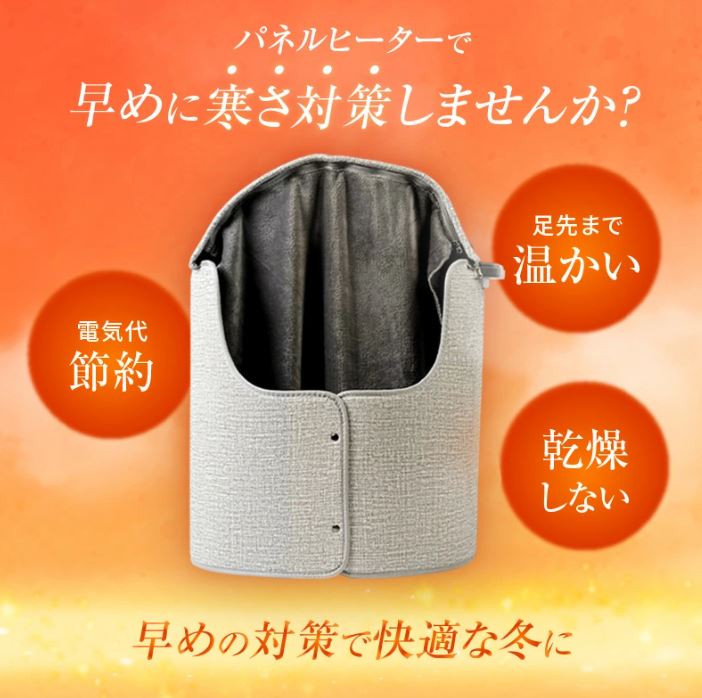 商品紹介 毎年大好評のパネルヒーターが今年も登場! ▼ 2026年最新モデル改良点 ▼ 多くのお客様からいただいたお声にお応えして パネル位置をより操作しやすく、さらにマグネットを強化して安定感をUP! 電源のオンオフや温度調節が 屈まずにできるようになって、更に使いやすさアップ♪ ▼ もちろんいいところはそのまま ▼ 大きめで取り外し可能なブランケットは 手洗いもできるので汚れても大丈夫。 また、延長コードもついているので、 電源が遠い場所でも使用可能です。 足を組んでも膝があたらないよう 当店のパネルヒーターは幅も奥行も広め。 キッチンなど立って使う場合は、 天板を外して開いて使うこともできます。 3つの自動電源OFF機能があるから、 つけっぱなしにならずに安心安全。 また、電気代の節約にも◎ シーズンが終わったら、 くるくる巻いて収納袋へ。 すっきりコンパクトになるから 来年も再来年もずーっと使えます。 受験勉強や在宅ワーク、 冬場のキッチンなどはもちろん、 お一人暮らしの方にもおすすめです♪ ※PSE&CE認証済み。 スペック 本体サイズ:直径約52cmx高さ約51cm 消費電力:160W コード長さ:約140cm 重量:約1.89kg ※詳細なスペックは画像をご参照ください。 付属品 専用リモコン 収納用バンド(長さ65cm) 延長コード(95cm) スタンドx2 収納袋 説明書 注意事項 ・商品の開封時に素材の臭いを感じる場合がありますが、人体への影響はありません。 湿気が少なく風通しの良い日陰にしばらく置いて頂くと自然に軽減されていきます。 ・使用時の破損や事故等につきましては責任を負いかねます。 ・輸入品の為、輸送の際に生じるキズ・汚れ・箱潰れがある場合がございますが新品です。 ・サイズ・重量は、多少の誤差が生じる場合がございます。 ・あくまで画像はイメージですので、商品改良の為パッケージや一部仕様が少し変更になる場合もございます。 ・お使いのブラウザや設定により、画像と実際の商品との若干の色の違いが生じる場合がございます。 ・会社概要・お買い物ガイドに他にも詳しく記載しておりますので事前に確認していただくことをお勧め致します。 生産国 中国製 ※ 日本製 の製品と同等の検品体制で 品質管理を行っております 関連ワード ヒーター 小型 足元 オフィス 省電力 足元 あったかグッズ 電気 節電 足元 温める グッズ 足元 暖かい 足元ヒーター マット